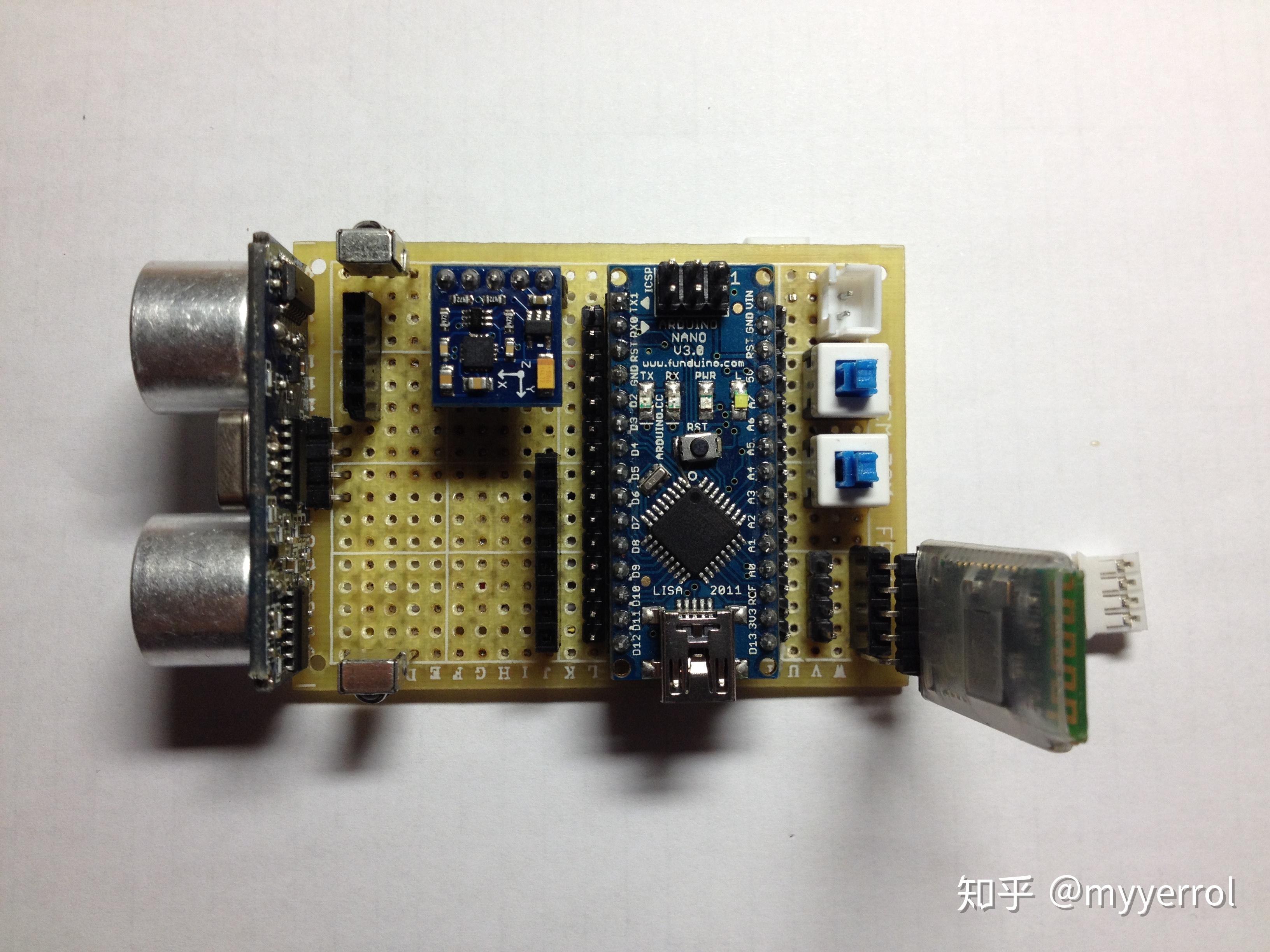 下图是机器人的控制单元模块。该控制单元模块主要由Arduino Nano控制板、HMC58883L电子罗盘传感器、MPU6050惯性测量传感器(图中的底座上未插入)、HC-SR04超声波传感器和红外接收管等组成,为了方便在模块出现问题时能够对其进行更换,我在洞洞板上焊接了一些棑母底座,这样模块就可以直接插在棑母底座上,拆卸很方便。此外,有关电路原理部分的详细介绍可以阅读下面的原理章节。