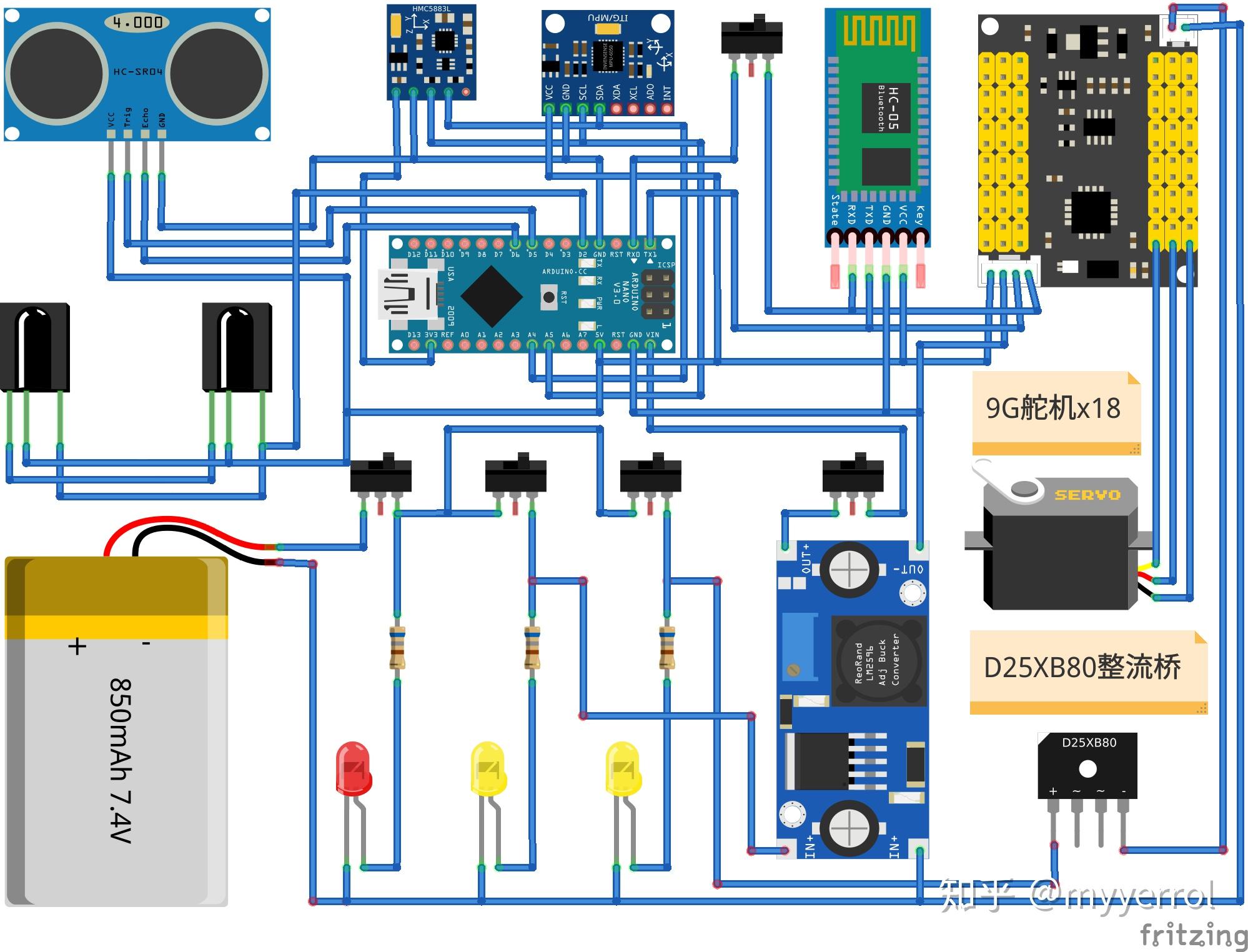 除了锂电池电源之外,从上面的硬件系统连接图中还可以看到有两个降压电路,其中一个降压电路使用L2596 DC-DC模块将一路电源的电压降到标准的5V,用于给Arduino Nano主控制板供电,而另一路使用的是D25XB80大功率整流桥,它拥有标称800V的最大逆向电压和25A的额定前向电流,在锂电池组充满电的情况下(标称7.4v的锂电池组充满电的电压大概在8.4v左右),连接一片D25XB80可以使电压整体降到大概6.9v,经测试给24路舵机控制板和18个舵机供电是没有问题的。