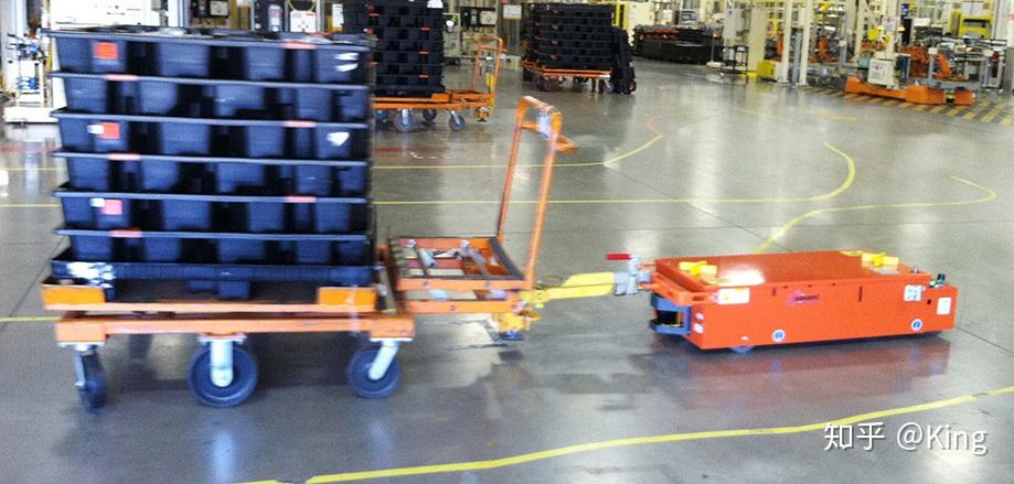 有些应用场景下,一次需要搬运的物料单元较多,而普通AGV通常一次只能带载一个物料单元,单位时间内的吞吐效率比较低,而采用牵引的方式,可以通过拉动小车的方式一次带载大量的物料一次性完成搬运,如下: