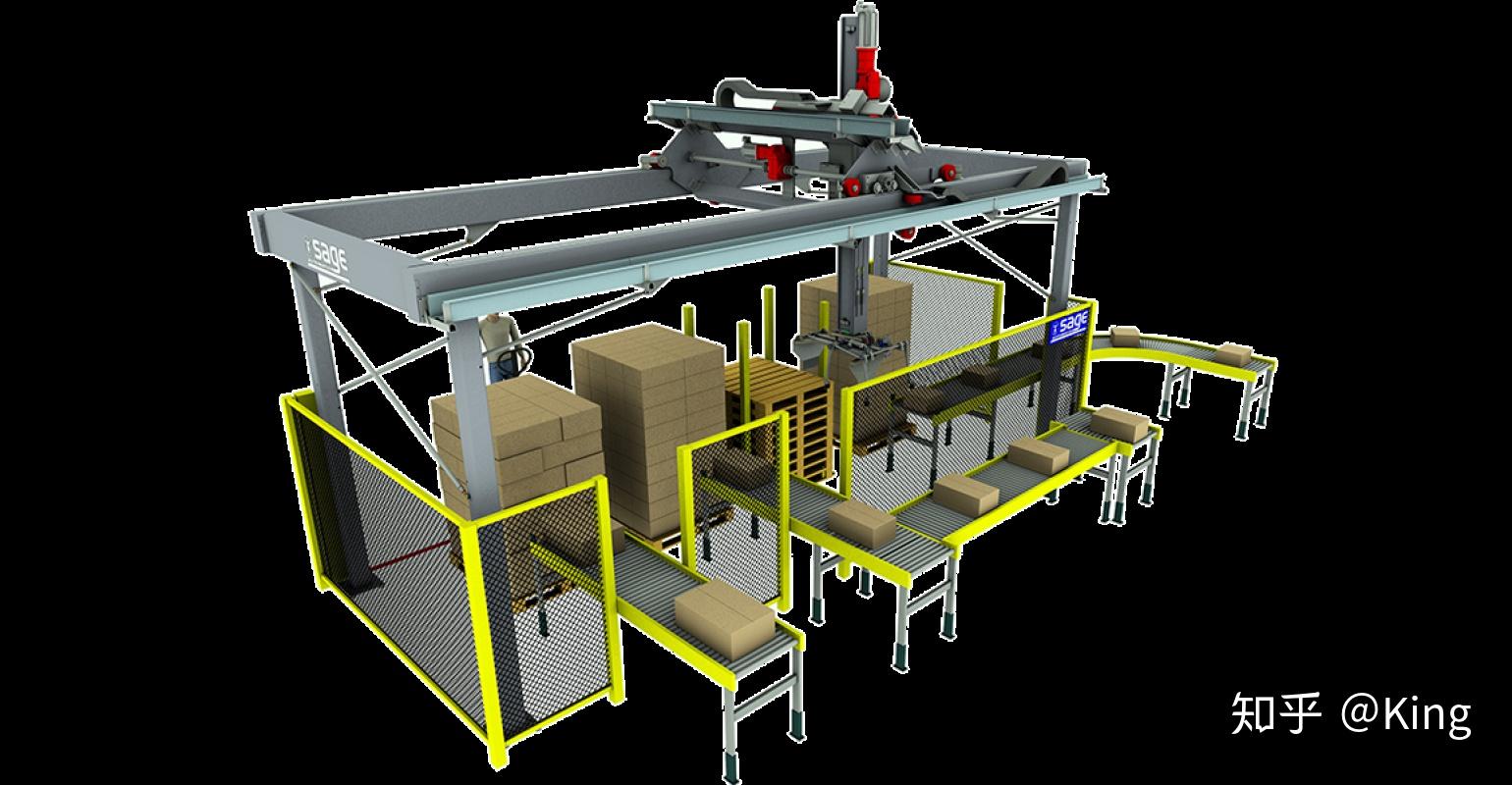 以上的各种机器人都是基于标准多轴机器人本体配合夹具的方式完整物料的自动抓取的。还有一种在仓储物流自动化里用到的机器人叫直角坐标机器人或者龙门机器人或者桁架机器人。