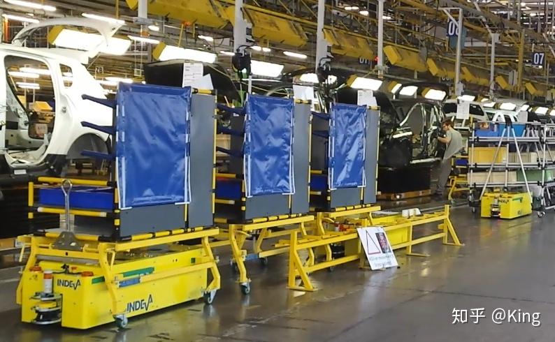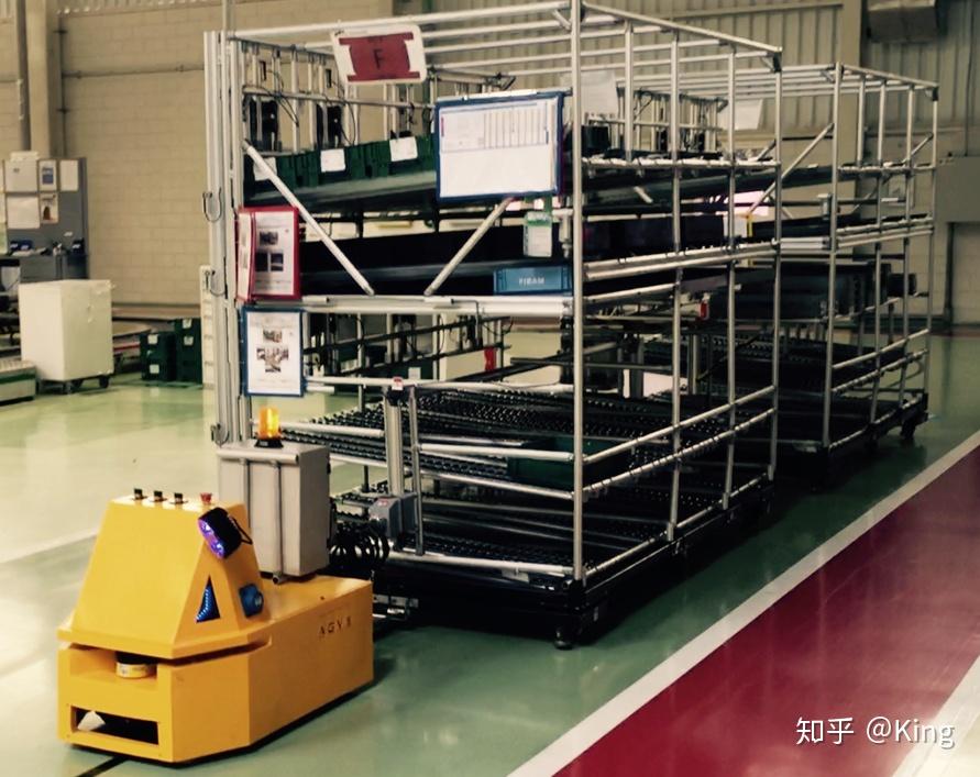 在汽车制造行业经常能看到背托式的AGV,物料单元被存放在AGV的车身正上方,在不同的工位之间来回搬运,到达一个工位后等物料被处理完或完成本道工艺加工后再继续搬运到下一个位置点。