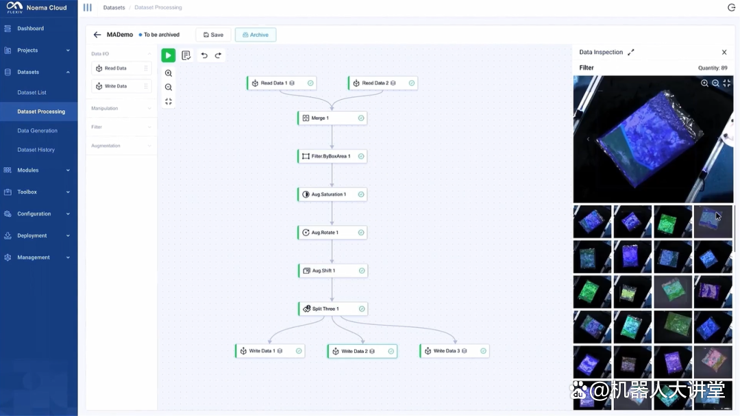 有了手和臂后,非夕还发布了完整的通用“大脑”——穹知NOEMA系统,包括了穹知云平台、穹知边缘系统和穹知边缘控制器。用户可以非常轻松地进行AI模型的开发和解决方案的全生命周期管理,包括数据治理、模型训练、算子编排、方案部署,和维护调试等功能。