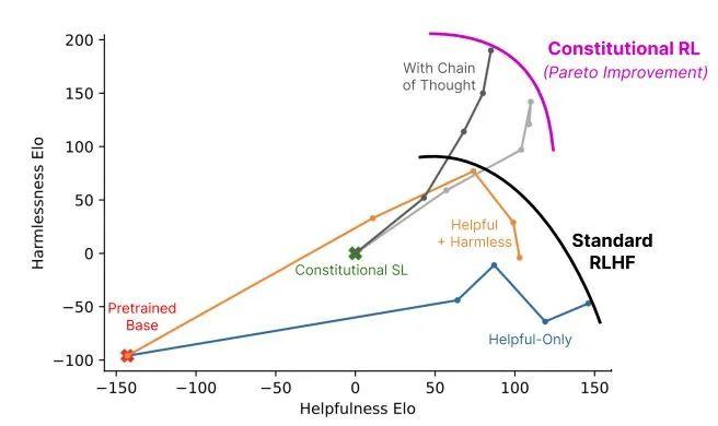 Claude 和 ChatGPT 都依赖于强化学习(RL)来训练偏好(preference)模型。CAI(Constitutional AI)也是建立在RLHF的基础之上,不同之处在于,CAI的排序过程使用模型(而非人类)对所有生成的输出结果提供一个初始排序结果。CAI用人工智能反馈来代替人类对表达无害性的偏好,即RLAIF,人工智能根据一套constitution原则来评价回复内容。
