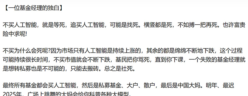 目前,市场上对于AI投资的热情已经较高。近日,一篇《一位基金经理的独白》的文章也在网络上传播较广,文中更夸张地提到“不买人工智能,就是等死,追买人工智能,可能是找死。横竖都是死,不如搏一把再死。也许富贵险中求呢!”