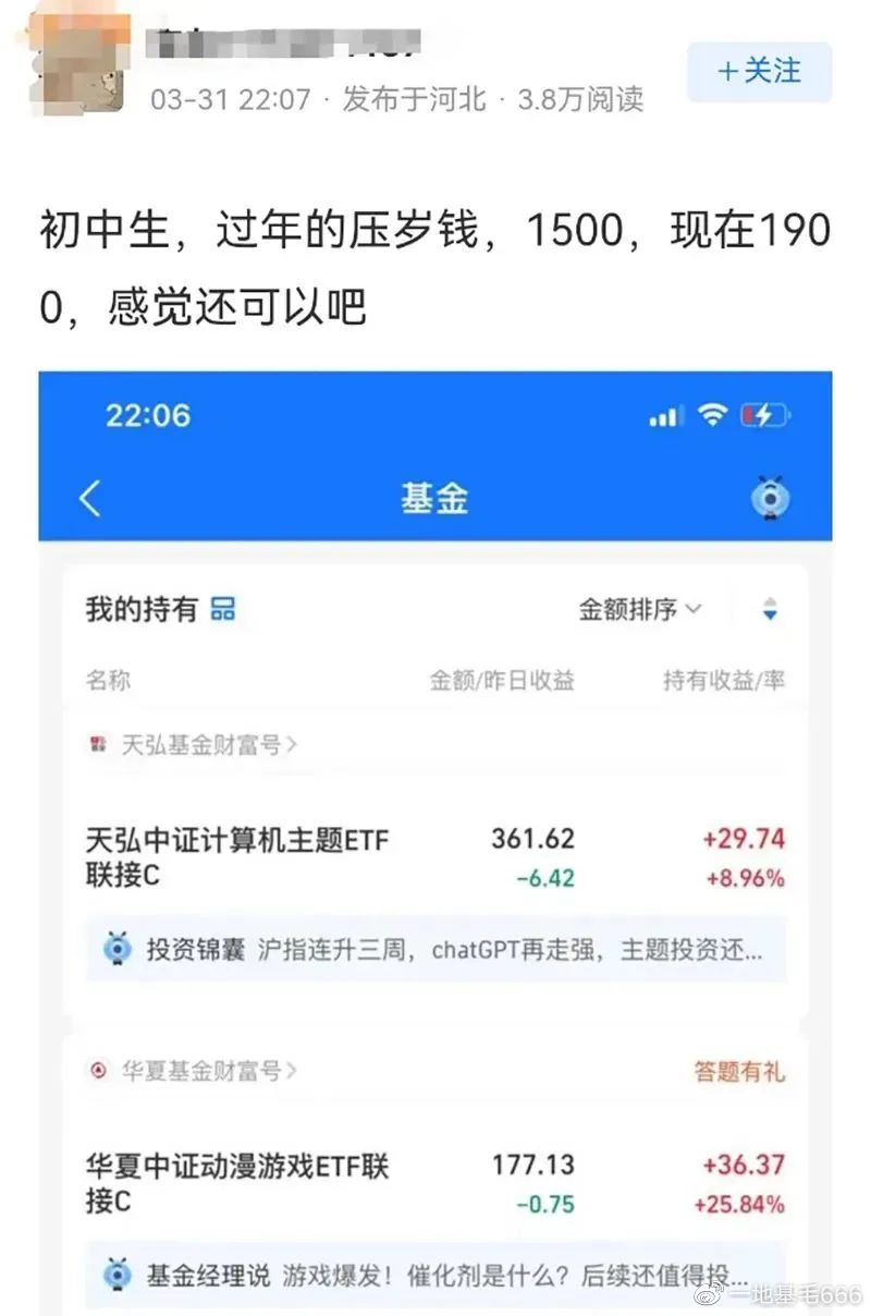 “初中生,过年的压岁钱1500元,现在1900元,感觉还可以吧。”近日,有网友在基金社区发帖称,已经用压岁钱赚了26.7%,如果按春节到现在算,不过2个多月,而他/她只是个初中生。