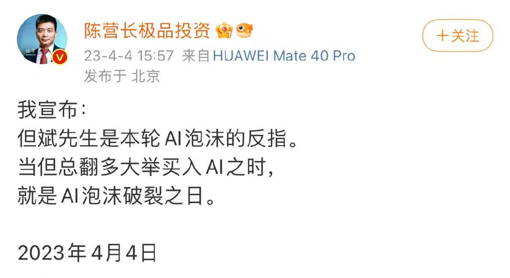 但斌对此回应表示:“我们现在已经持有全球最重要的AI企业,而且是ChatGPT的龙头企业,已经发生了。”不过陈宇并不买账,他回怼称“必须买A股才算。”