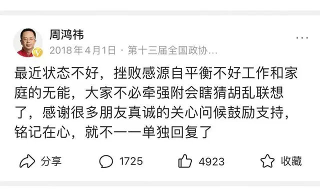 2018年3月31日,周鸿祎突然在朋友圈感慨人生失败,没有任何意义。当时外界传闻周鸿祎婚姻出现一些问题。4月1日,周鸿祎在微头条回应“最近状态不好,挫败感源自平衡不好工作和家庭的无能,大家不必牵强附会瞎胡乱猜想了。”这件往事也在离婚事件讨论中频繁出现。