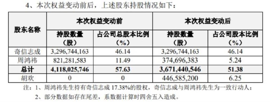公司获悉2023年4月4日周鸿祎先生与胡欢女士经友好协商,已办理解除婚姻关系手续,并就股份分割等事宜作出相关安排。根据周鸿祎先生与胡欢女士签订的《离婚协议书》,周鸿祎先生拟将其直接持有的公司446,585,200股股份(约占公司总股份的6.25%)分割至胡欢女士名下。本次权益变动不会导致公司控股股东、实际控制人发生变化,不涉及公司控制权变更。